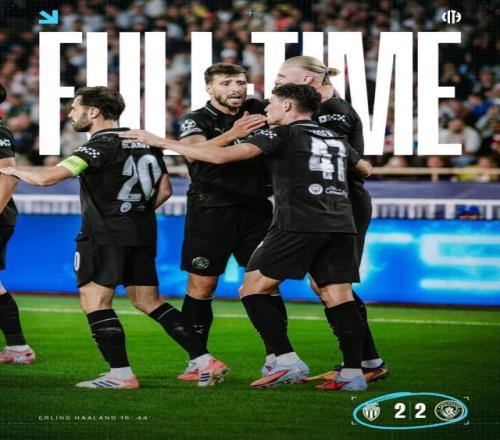 欧冠联赛阶段第二轮,曼城做客挑战摩纳哥。哈兰德首开纪录,特泽远射世界波扳平比分,哈兰德头球再度帮助曼城领先。常规时间最后时刻,尼科·冈萨雷斯抬脚过高送点,埃里克·戴尔罚入点球,摩纳哥完成绝平。最终两队2比2握手言和。