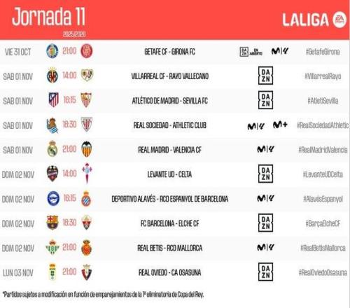 西甲第11轮开球时间(北京时间)