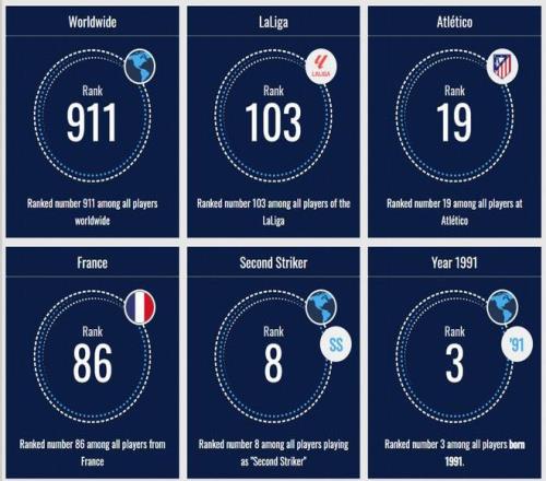 格列兹曼的德转身价目前在西甲排名第103位,位居马竞队内第19,法国国家队第86,在所有二前锋中排名第八。本赛季为马竞出场九次,首发四次,打进两粒进球。